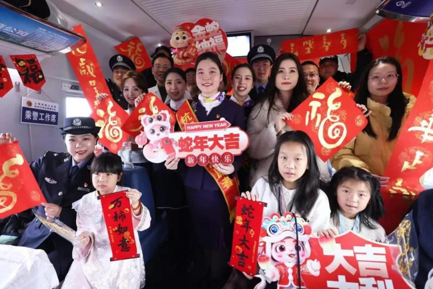 中国农历春节即将到来,在杭州客运段G176次杭州东—南京南区间,乘务人员与旅客一起拓年画、做糖人、写对联,陪大家共迎新春 图源:潮新闻客户端